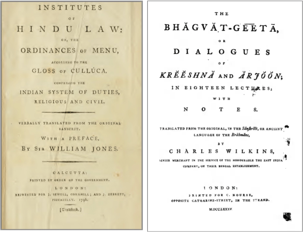 But before Duperron, the British had prioritized studying and producing translations of Sanskrit works after setting up the East India Company’s HQ in Calcutta. The first translation of a work from Sanskrit to English that made a mark on European audiences was the English translation of the Bhagavad Gīta from the original Sanskrit by Charles Wilkins in 1785. This followed Sir William Jones’ 1776 publication of his translation of the Manusmṛti Dharmic law codes to create a colonial Hindu law code mirroring English Civil Law. After facing similar difficulties to Duperron with pandits being unwilling to teach him, Jones finally found a doctor willing to teach him Sanskrit. Having trained under Jones, Wilkins translated this specific portion of the Sanskrit Epic poem Mahabhārata (MBh.) because it contained a discourse by the Hindu god Kṛṣṇa on how humans could attain spiritual liberation through proper actions and devotion to him alone. The text’s emphasis on Kṛṣṇa as the singular supreme deity was problematically interpreted as a sign of Hinduism’s “development” from old-world, uncivilized polytheism to a more acceptable monotheism that reflected Abrahamic religions. This served the East India Company’s goal of convincing shareholders that understanding Indian culture through translation projects and Sanskrit education was worth their investment.