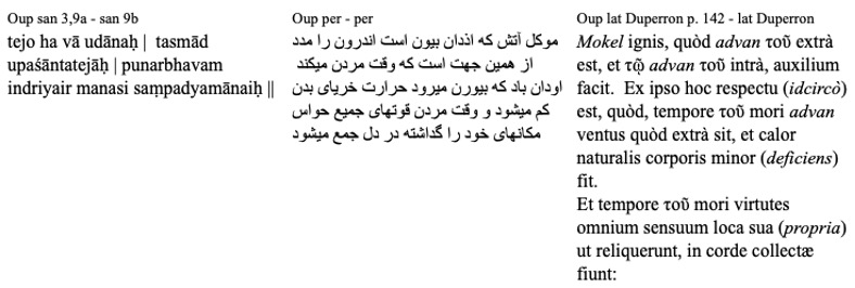 In 1801, he published his translation of this Persian version into Latin, but his French translation was published posthumously. This really was the first translation of a Sanskrit work into Latin for the broader European intelligentsia, though the fact that it was itself produced from another translation presents the reader with various challenges. Duperron reveals his translation process: word for word (ad verbum) from the Persian language, mixed with Sanskrit terminologies (Samskreticis vocabulis intermixto). The reader must know Latin, but also some Persian and Sanskrit from which words are mixed into the Latin translation. Occasionally, there’s even a Greek article thrown in as you can see below[6]: